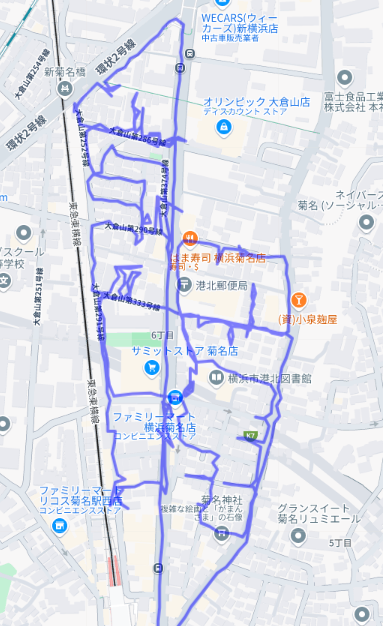 ※上図は菊名6丁目をポスティングした際のGPSデータです。