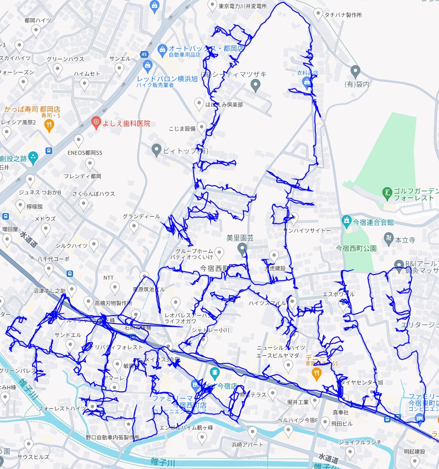※上図は旭区今宿西町をポスティングした際のGPSデータです。
