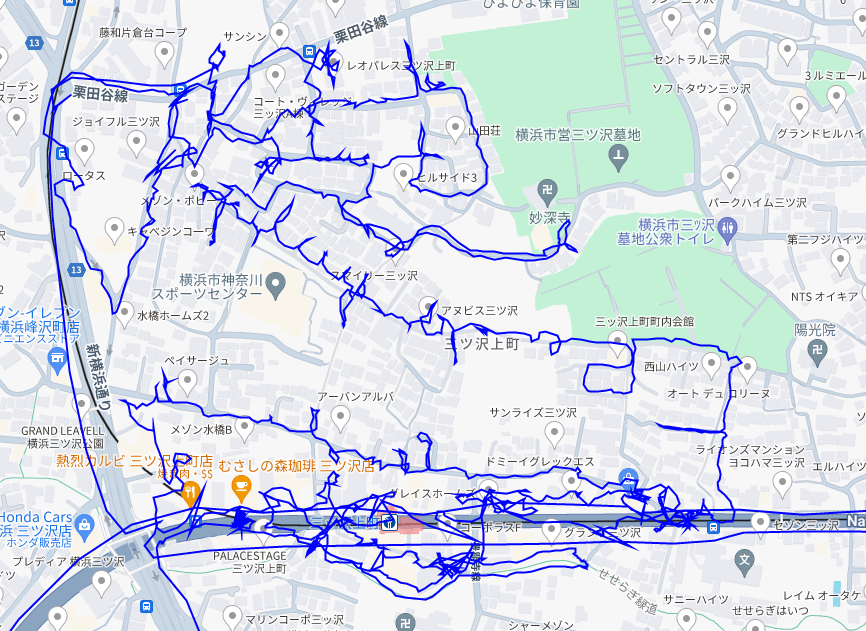 ※上図は三ツ沢上町をポスティングした際のGPSデータです。