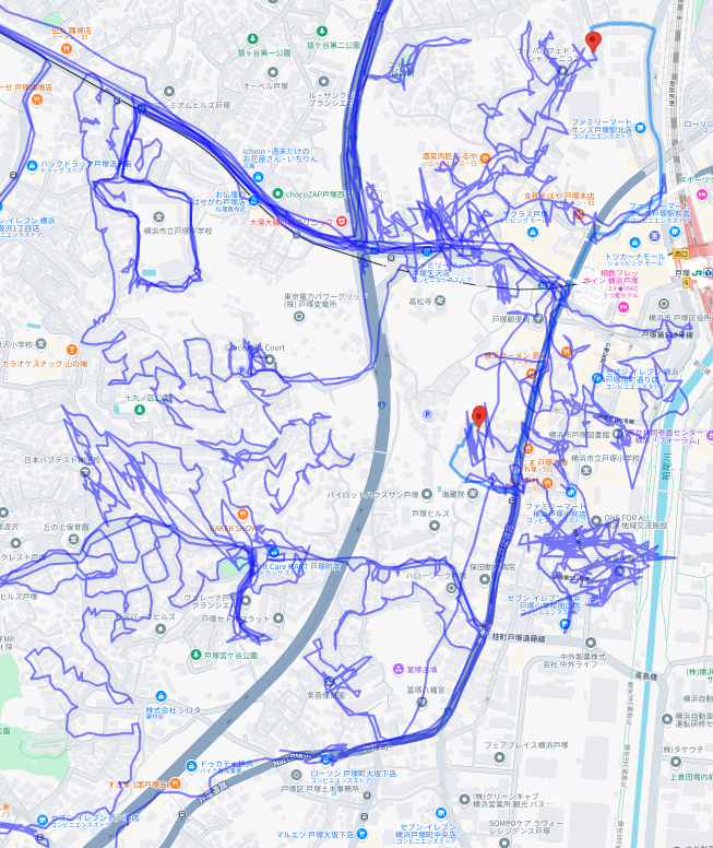※上図は戸塚町(北側)をポスティングした際のGPSデータです。