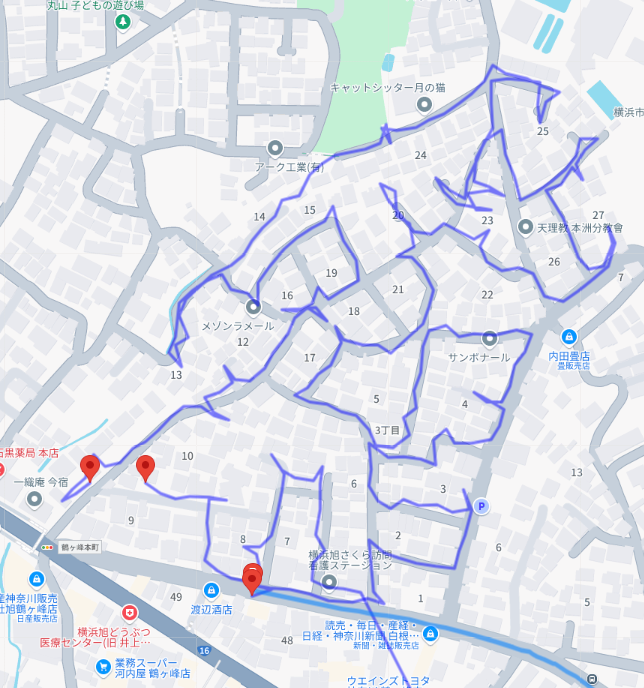 ※上図は鶴ヶ峰本町3丁目をポスティングした際のGPSデータです。
