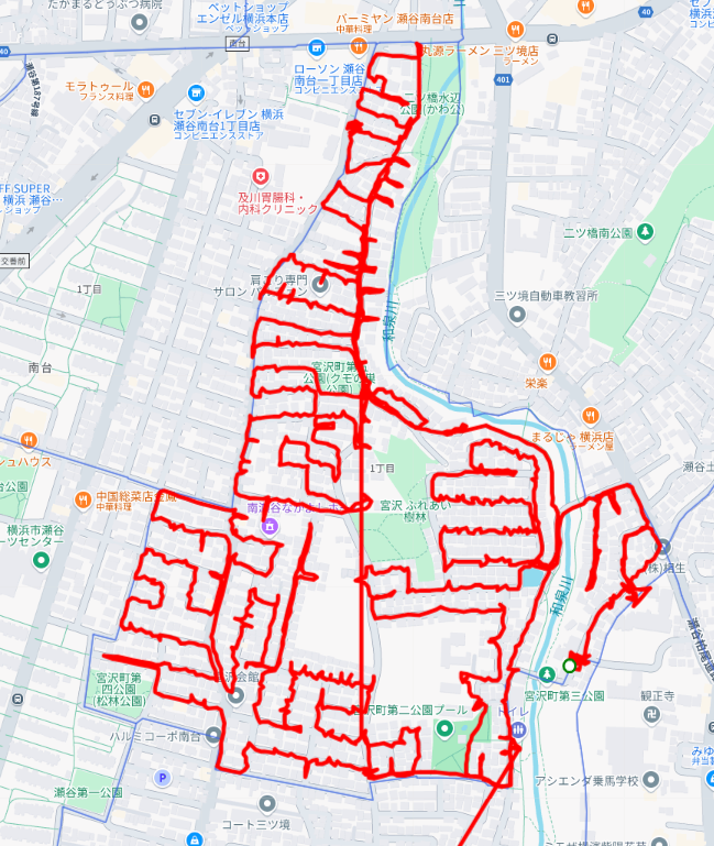 ※上図は宮沢1丁目をポスティングした際のGPSデータです。