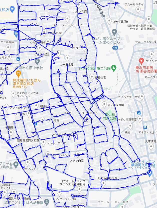 ※上図は阿久和西2丁目をポスティングした際のGPSデータです。