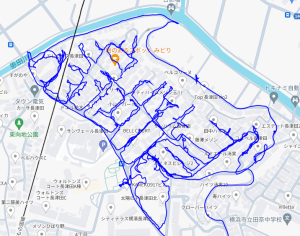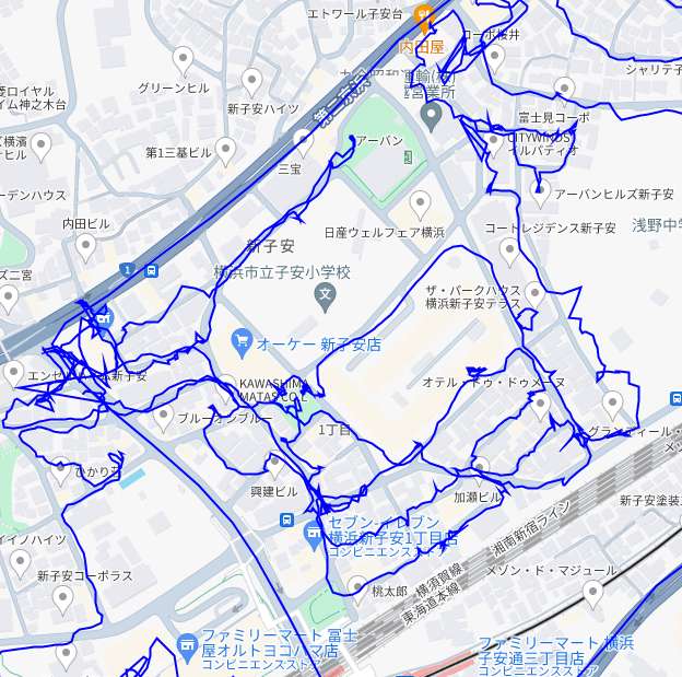 ※上図は新子安1丁目をポスティングした際のGPSデータです。
