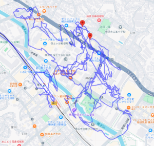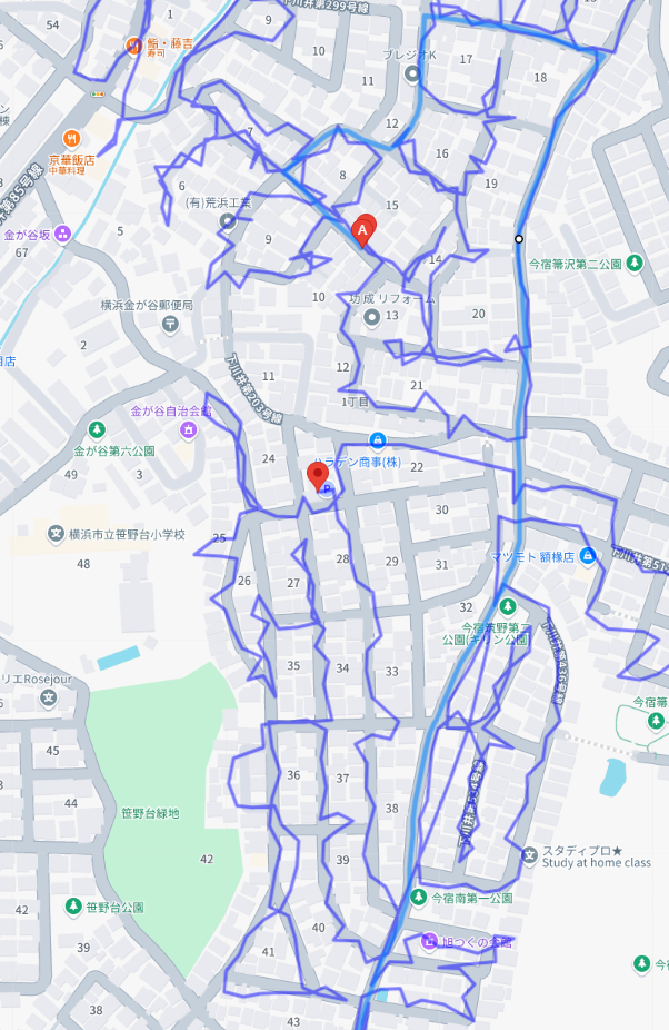 ※上図は金が谷1丁目をポスティングした際のGPSデータです。