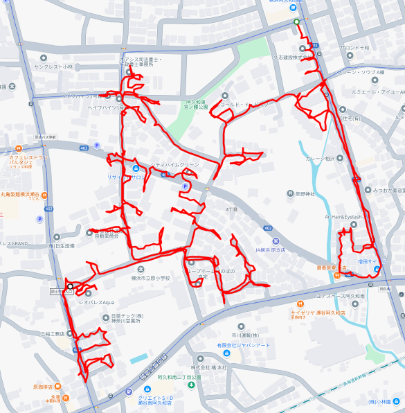 ※上図は阿久和東4丁目をポスティングした際のGPSデータです。