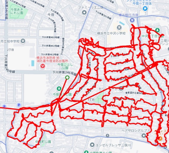 ※上図は中沢1丁目をポスティングした際のGPSデータです。