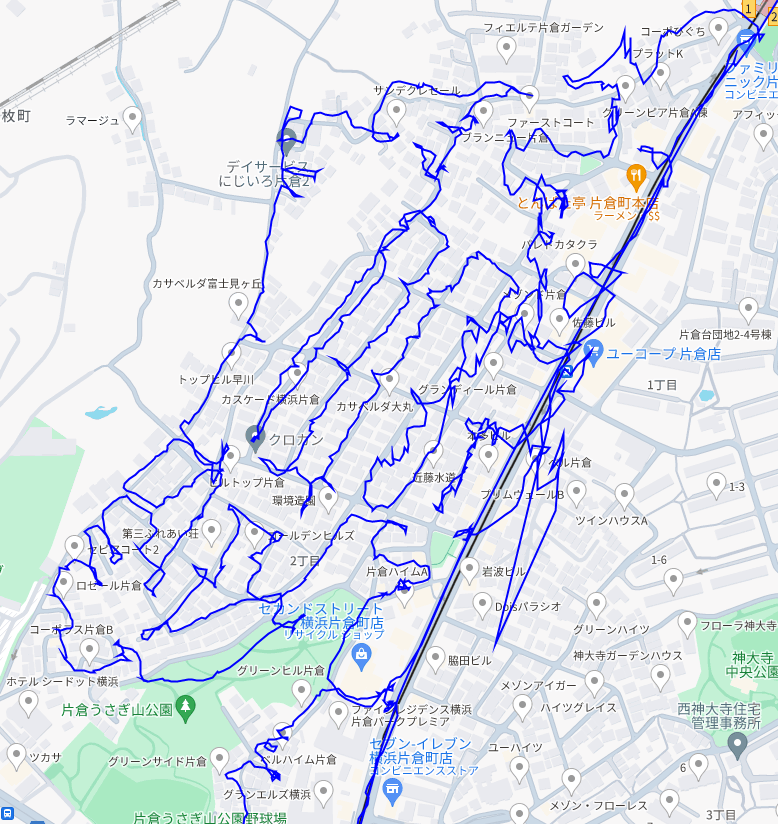 ※上図は片倉2丁目をポスティングした際のGPSデータです。