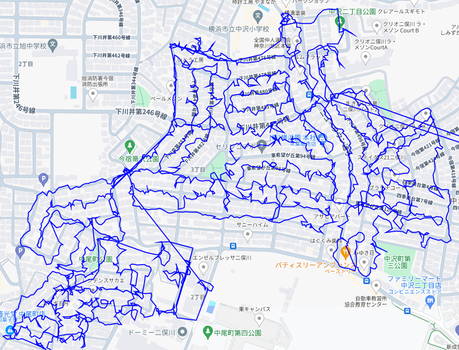 ※上図は中沢3丁目をポスティングした際のGPSデータです。