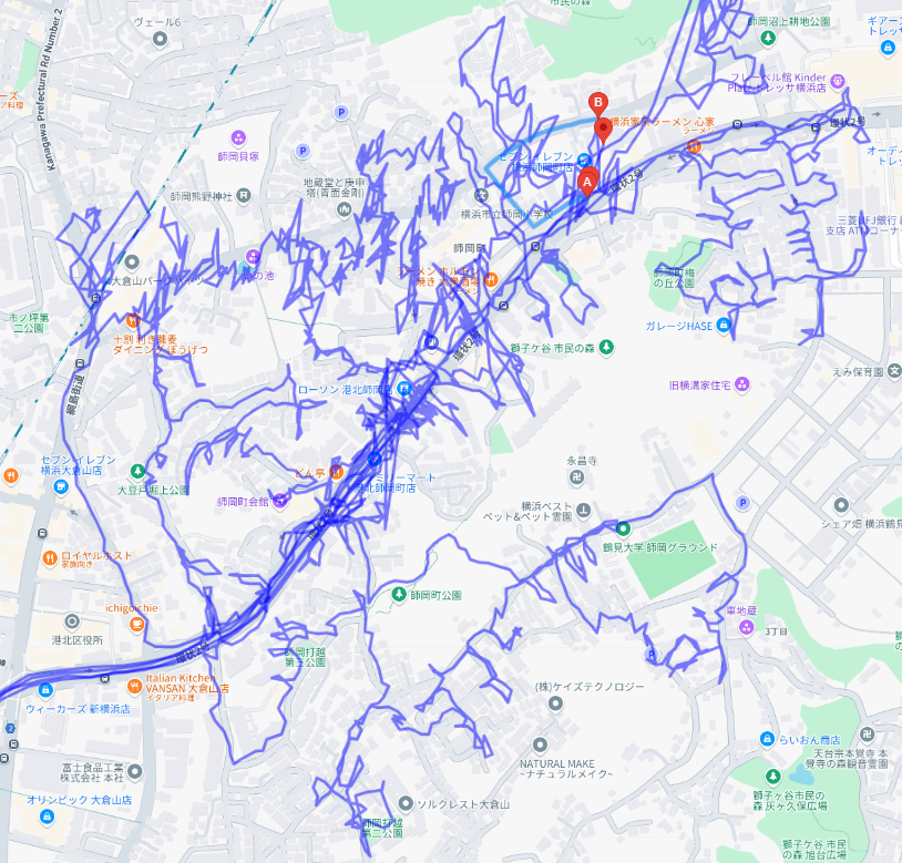 ※上図は師岡町をポスティングした際のGPSデータです。