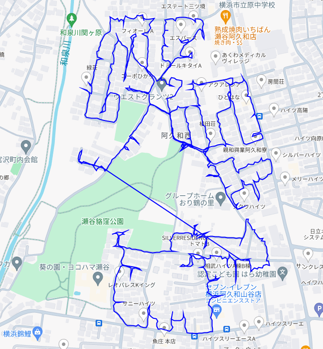 ※上図は阿久和西3丁目をポスティングした際のGPSデータです