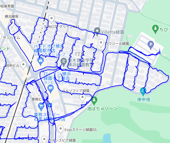 ※上図は緑園7丁目をポスティングした際のGPSデータです