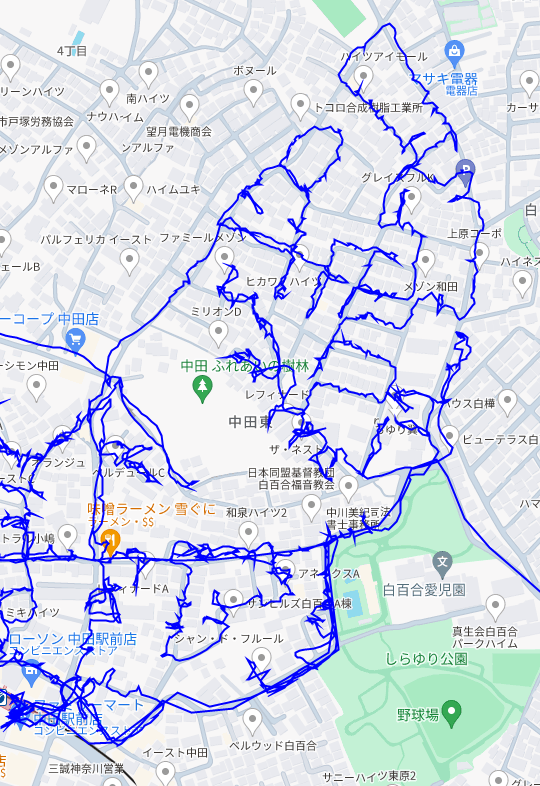 ※上図は中田東2丁目をポスティングした際のGPSデータです