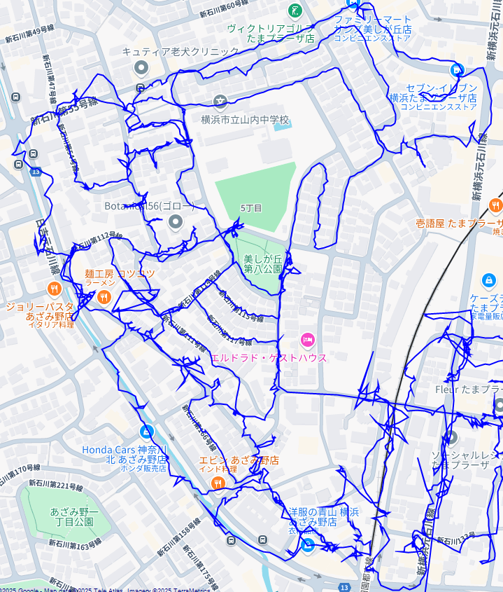 ※上図は美しが丘5丁目をポスティングした際のGPSデータです