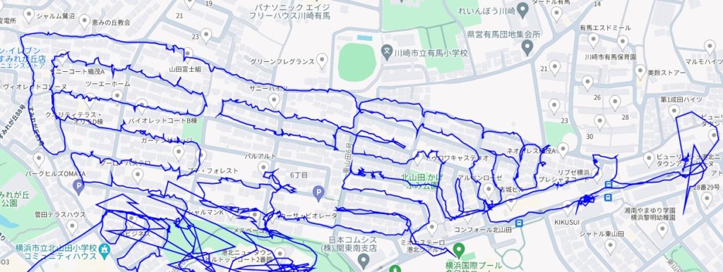 ※上図は北山田6丁目をポスティングした際のGPSデータです。