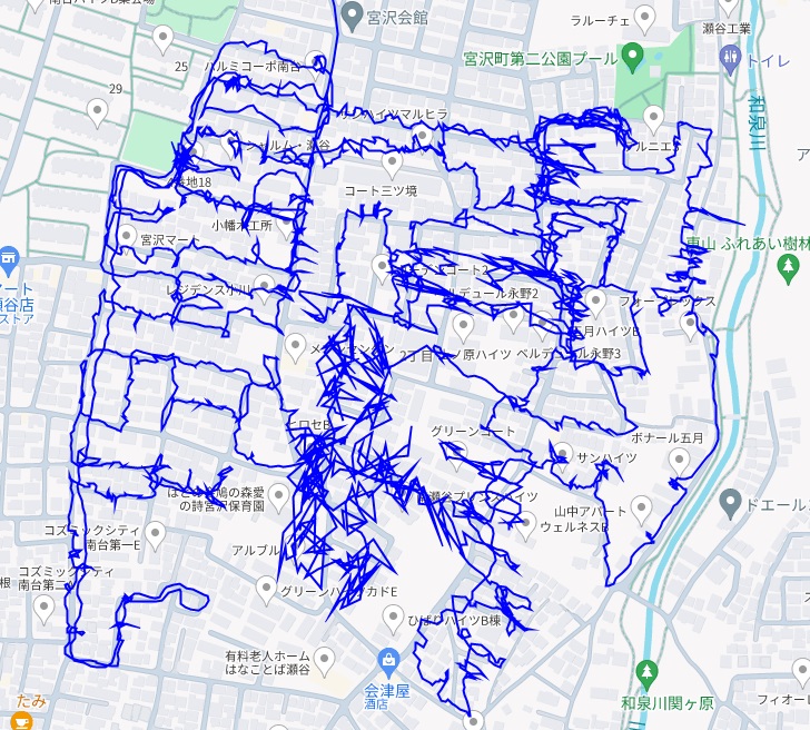 ※上図は宮沢2丁目をポスティングした際のGPSデータです。