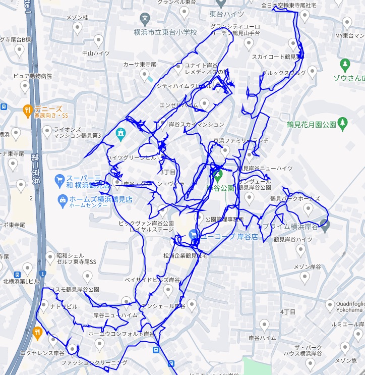 ※上図は岸谷3丁目をポスティングした際のGPSデータです。