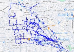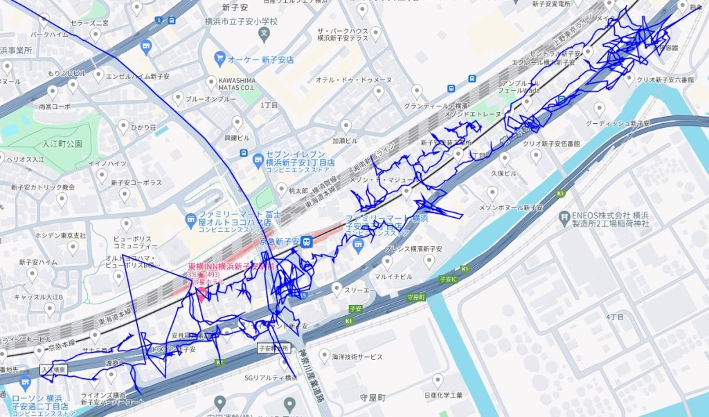 ※上図は子安通2-3丁目をポスティングした際のGPSデータです。