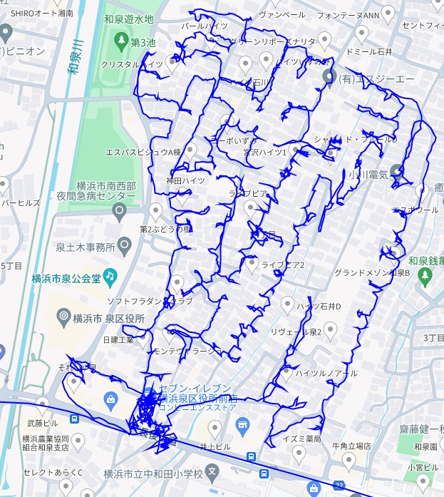 ※上図は和泉中央北4丁目をポスティングした際のGPSデータです。