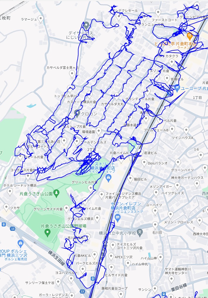 ※上図は片倉2丁目をポスティングした際のGPSデータです。