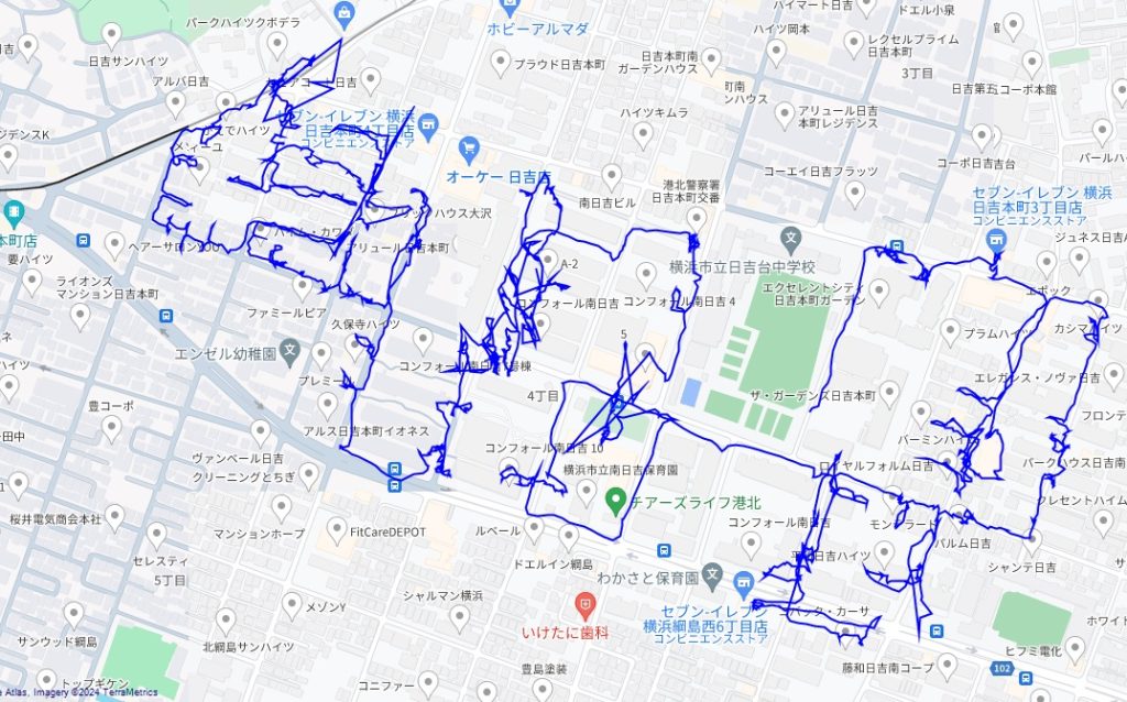 ※上図は日吉本町4丁目をポスティングした際のGPSデータです。