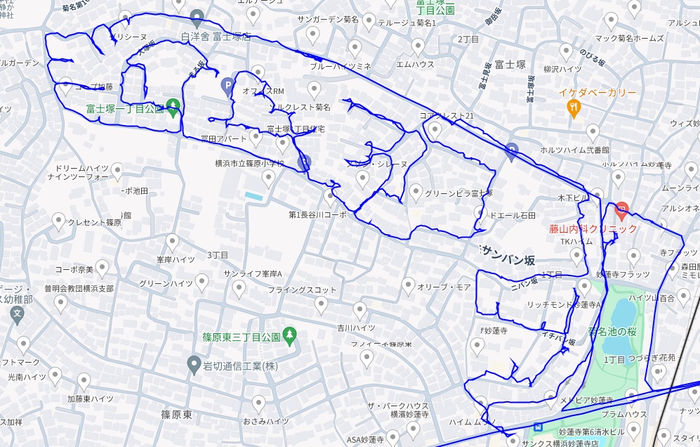 ※上図は富士塚1丁目をポスティングした際のGPSデータです。