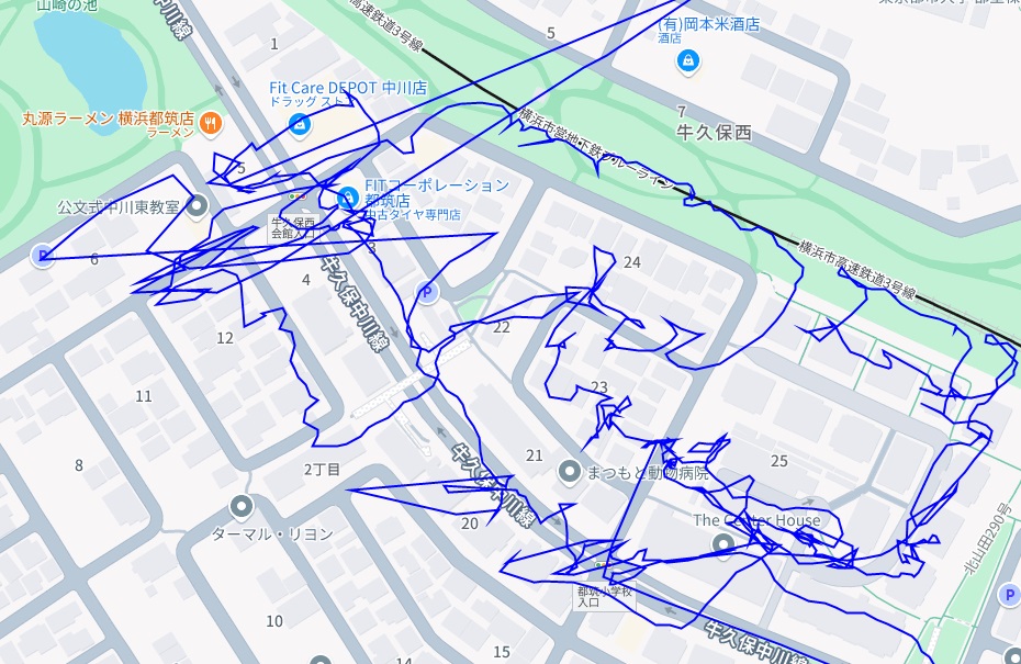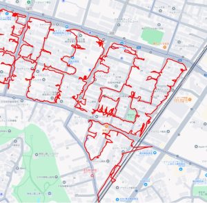 ※上図は牛久保西2丁目をポスティングした際のGPSデータです。