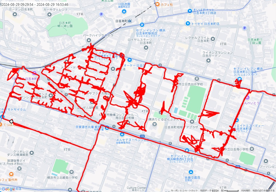 ※上図は日吉本町4丁目をポスティングした際のGPSデータです。