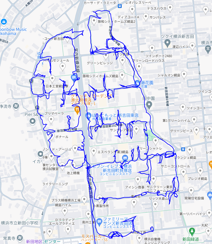 ※上図は新吉田東8丁目をポスティングした際のGPSデータです。