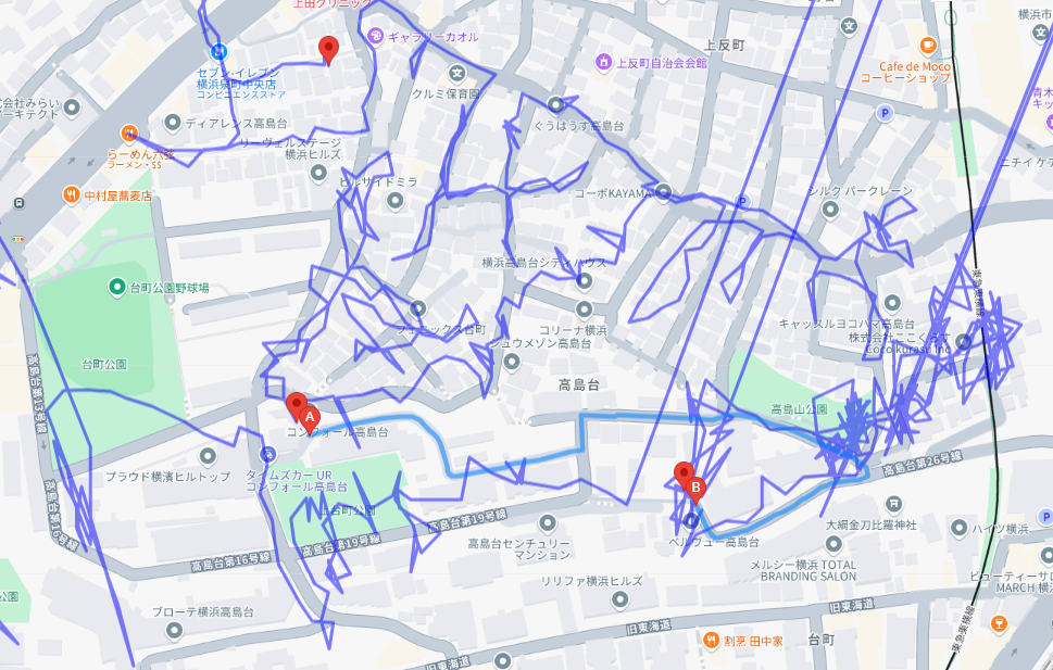 ※上図は高島台をポスティングした際のGPSデータです。